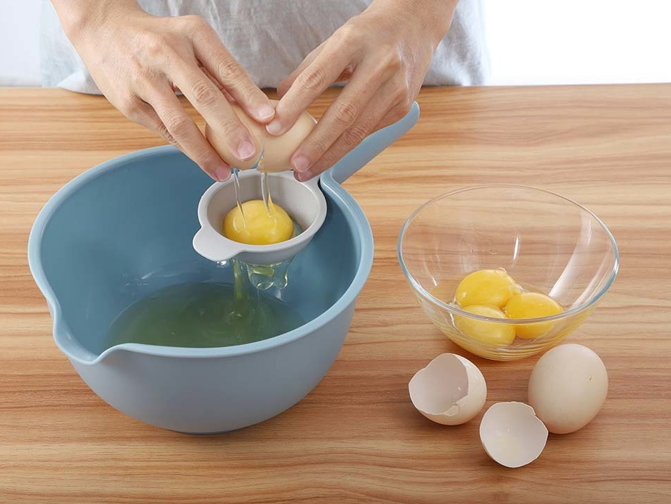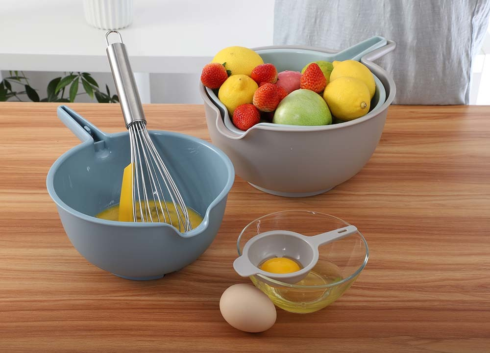 ハンドルで結合してコンパクトに収納できる、ボウル、コランダー(ザル)、エックセパレーターのセット!